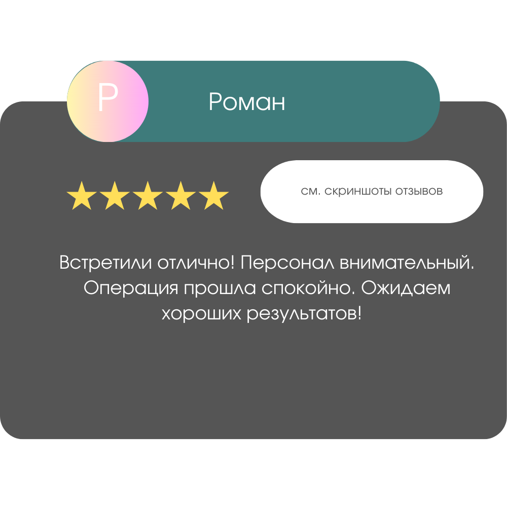 Мы полностью организуем ваш процесс — трансфер, проживание в отеле, необходимые медикаменты. Вам не нужно беспокоиться о деталях.